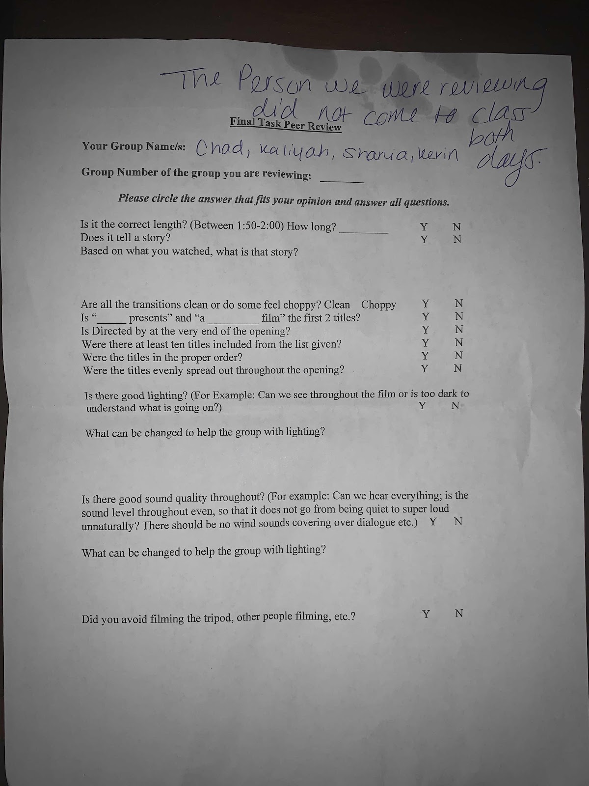 After we did that, we added some more scenes from the movie folder that we created and kept editing them to get the movie just right. It was then time for the class period to end, so we saved our work and put the computer back. The next time we had class we waited for the person that we were peer reviewing to show up. Once it was obvious the person was not going to show up we continued to edit again. We were taught how to get different titles online and insert them in the editing software that we use. After finding the titles and inserting them into the software, we inserted the titles into the film that we were editing. We then sent some scenes to the computer. These were scenes that we forgot to send the class before. In order to continue editing the film we had to insert the scenes that we sent to fill in the gaps. When we finished adding and editing the scenes we recorded the piece of the edited movie we had from our phones. We did this because the person peer reviewing us did not come to school that day, so we sent the recording to them for them to peer review us.